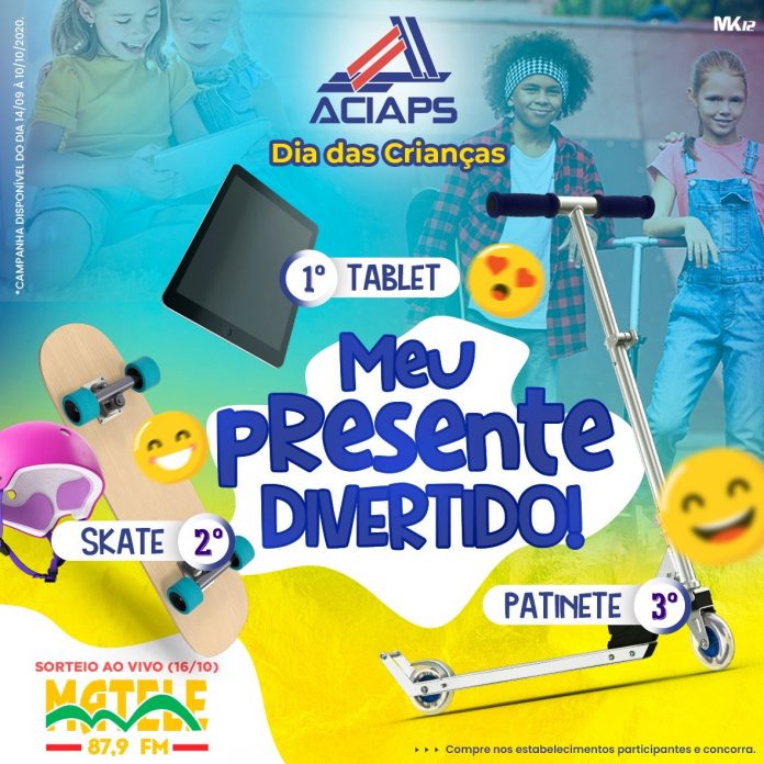Prevendo melhores resultados para o Dia das Crianças, a Associação Comercial Industrial, Agropecuária e Prestação de Serviços de Mateus Leme (Aciaps) está promovendo a campanha “Meu Presente Divertido”. A iniciativa abrange tanto os pais consumidores quanto as crianças que poderão ser contempladas com um presente extra na data.