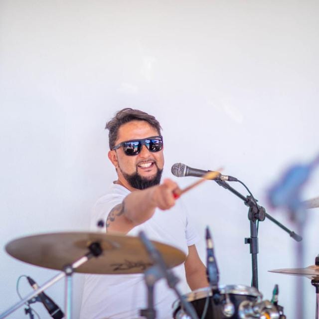 Ainda jovem, a curiosidade virou talento. Na escola, uma gincana o colocou pela primeira vez diante de uma bateria de verdade. “Por ter aquela ‘memória’ dos shows, acabei conseguindo tirar um som logo de cara”, conta. A partir dali a música nunca mais saiu de cena. Vieram as primeiras bandas, UQ, Canal-X, Tio Chico, Césio 137, MP7 e os anos de estrada em bares e eventos, até que o palco deu espaço à produção cultural e ao trabalho nos bastidores.