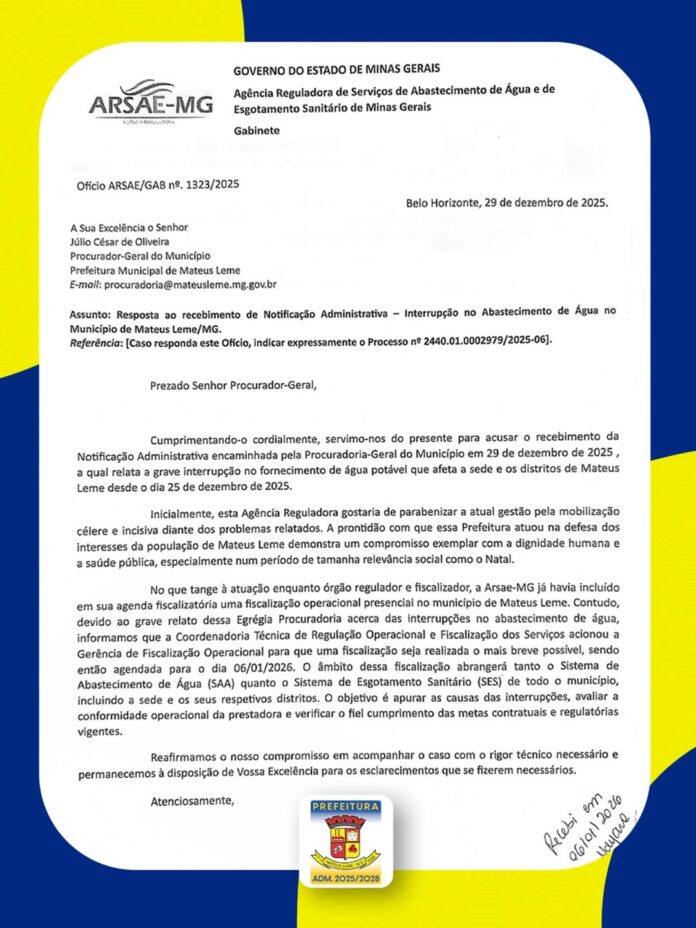 No dia 29 de dezembro, a Procuradoria-Geral do Município encaminhou uma Notificação Administrativa à Arsae-MG relatando a interrupção no fornecimento de água potável que se arrastava desde o dia 25. O documento destacou que o problema afetava tanto a área urbana quanto os distritos, causando transtornos à população.