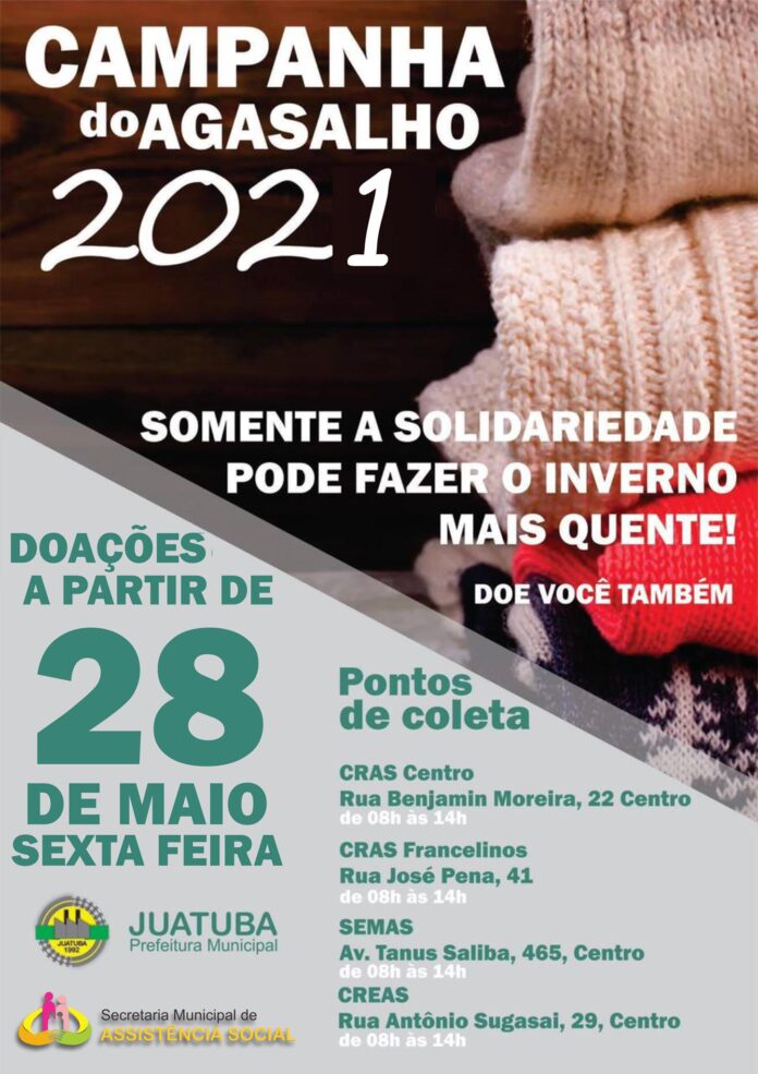 A Secretaria Municipal de Assistência Social de Juatuba lançou a “Campanha do Agasalho 2021”, pedindo à população doações de roupas e cobertores que serão distribuídos a pessoas necessitadas. Os pontos de arrecadação são na Secretaria, na avenida Tânus Saliba, 465; no CRAS I, na rua Benjamim Moreira, 22; CRAS II, na rua José Pena, 41, em Francelinos e no CREAS que fica na rua Antônio Sugasai, 29. Esta semana, a concessionária AB Nascentes das Gerais, aderiu ao movimento e doou 30 cobertores confeccionados a partir de uniformes reciclados.