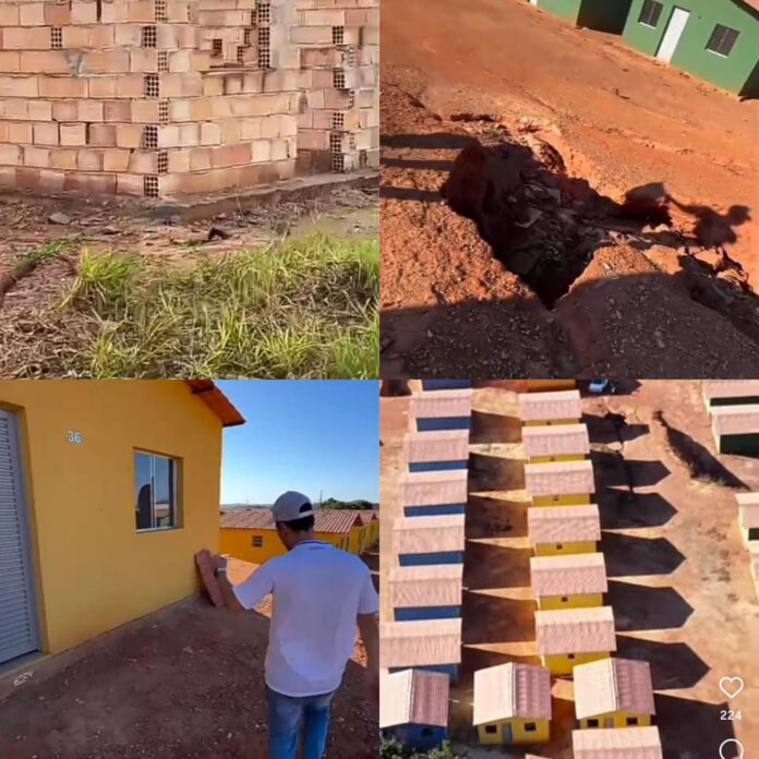 Em vídeos, moradores denunciam que as casas estão sendo entregues sem laje, sem colunas estruturais e com telhados de plástico que, em alguns casos, já foram arrancados pelo vento antes mesmo da ocupação. As residências também foram erguidas em ruas sem pavimentação e com grandes crateras, tornando o acesso quase impossível.
