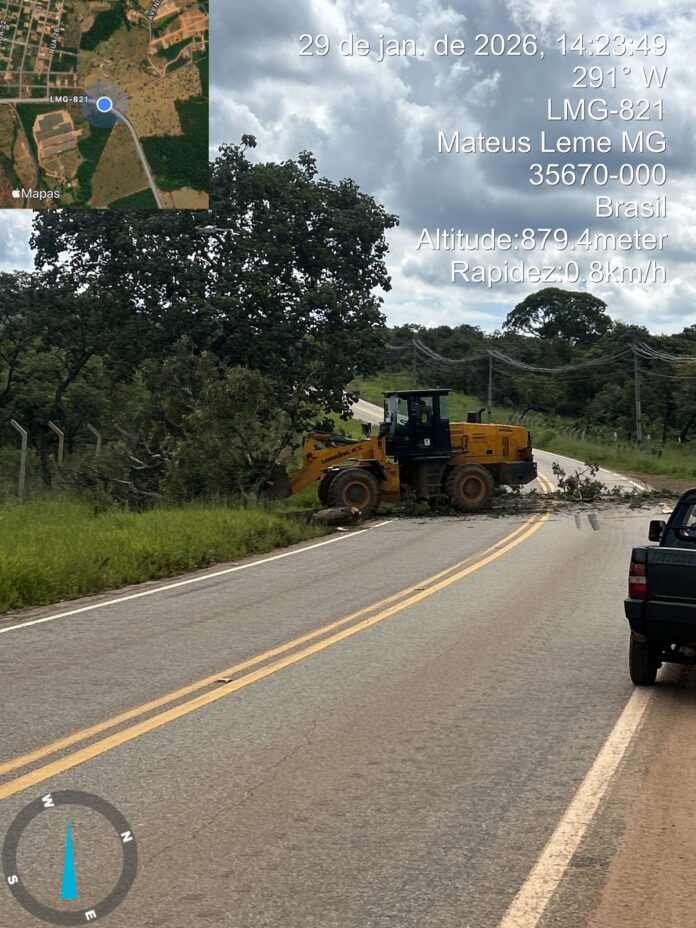 As chuvas registradas ao longo desta semana em Mateus Leme provocaram a queda de árvores em várias regiões da cidade. Um dos registros ocorreu na Rua Castro Alves, no bairro Vila Suzana. Outro ponto afetado foi a rodovia LMG-821, no km 7, na região de Queiroz, onde uma árvore caiu e obstruiu parcialmente a via pública.