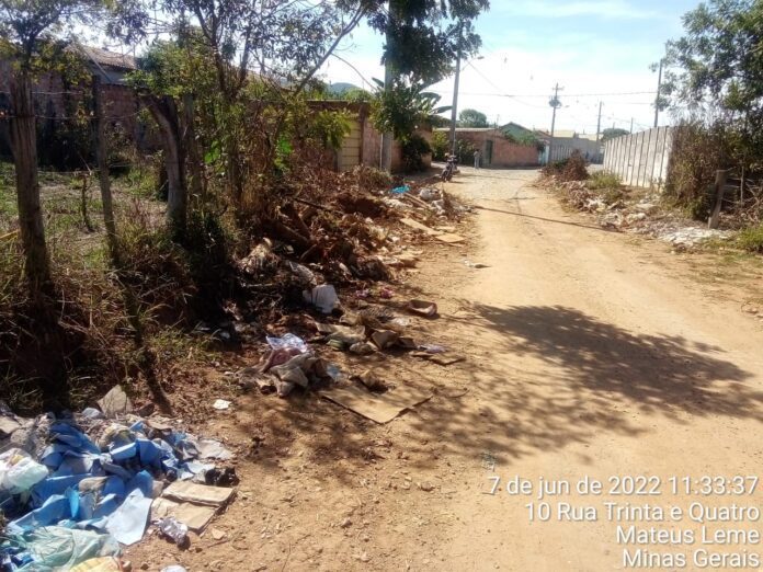 Em Mateus Leme a situação é caótica e, de acordo com os denunciantes, em cada esquina da região central é possível encontrar um bota-fora com entulho, restos de plantas, móveis velhos e até animais mortos. A situação se repete também nos distritos e bairros afastados do Centro. Um dos vídeos encaminhados à reportagem mostra o descarte de entulho em um campo de futebol. “Pais de crianças que usam o espaço para lazer se juntaram a nós para retirar o entulho do campo”, disse um esportista.