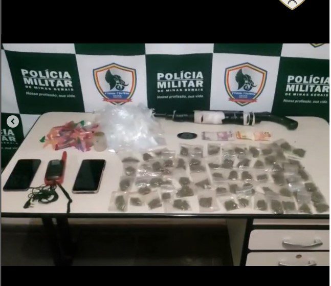 Nesse domingo (20) em Mateus Leme, após uma denúncia de disparo de arma de fogo no centro da cidade. A ação, conduzida por equipes do Tático Móvel, resultou na apreensão de drogas, dinheiro e materiais relacionados ao tráfico. Durante o patrulhamento, os policiais abordaram cinco indivíduos em atitude suspeita. Com o apoio de outras equipes e de um cão policial, foram realizadas buscas em uma residência próxima. No local, a polícia encontrou 68 porções de maconha, três celulares, um rádio comunicador, um simulacro de arma de fogo, R$ 30 em dinheiro e diversos materiais utilizados para embalar drogas. Os três adultos foram presos e os dois menores apreendidos, sendo todos encaminhados à delegacia para as providências cabíveis.