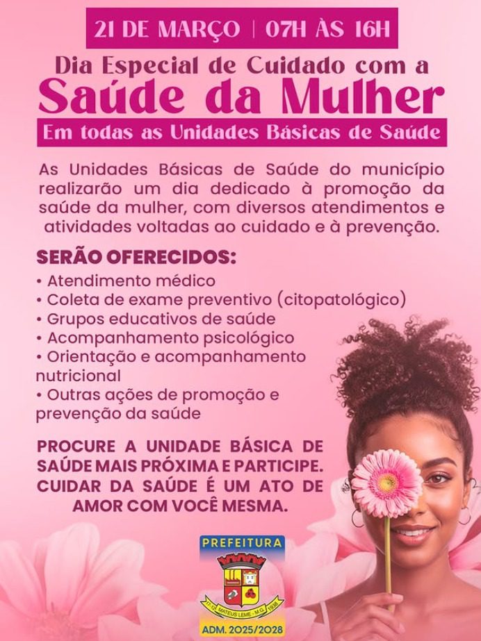 Neste sábado (21), das 7h às 16h, todas as Unidades Básicas de Saúde de Mateus Leme estarão mobilizadas para um dia especial voltado à saúde da mulher. Segundo a prefeitura, a ação tem como objetivo oferecer atendimento humanizado e incentivar a prevenção de doenças por meio de diversos serviços gratuitos.