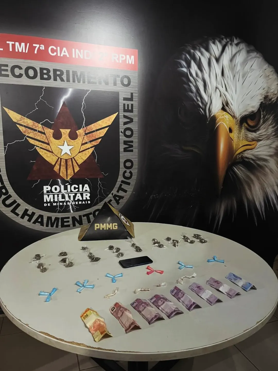 Com eles, foram apreendidas porções de maconha, pedras de crack e pinos de cocaína, além de dinheiro em notas diversas e um aparelho celular, itens que, segundo a polícia, reforçam a suspeita de comercialização de entorpecentes.