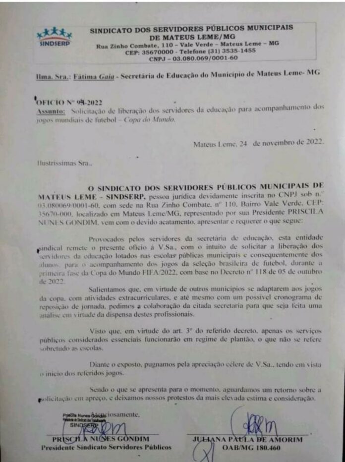 A insatisfação dos profissionais da educação foi tanta que a denúncia acabou chegando ao Sindicato dos Servidores Públicos de Mateus Leme, o SindSerp, que encaminhou ofício à Secretária da Educação, solicitando a liberação dos educadores para os jogos da Seleção Brasileira, tendo em vista que as dispensas em horários pré-determinados não afetariam os dias letivos, já que a Secretaria de Educação do Estado teria adotado o mesmo critério.