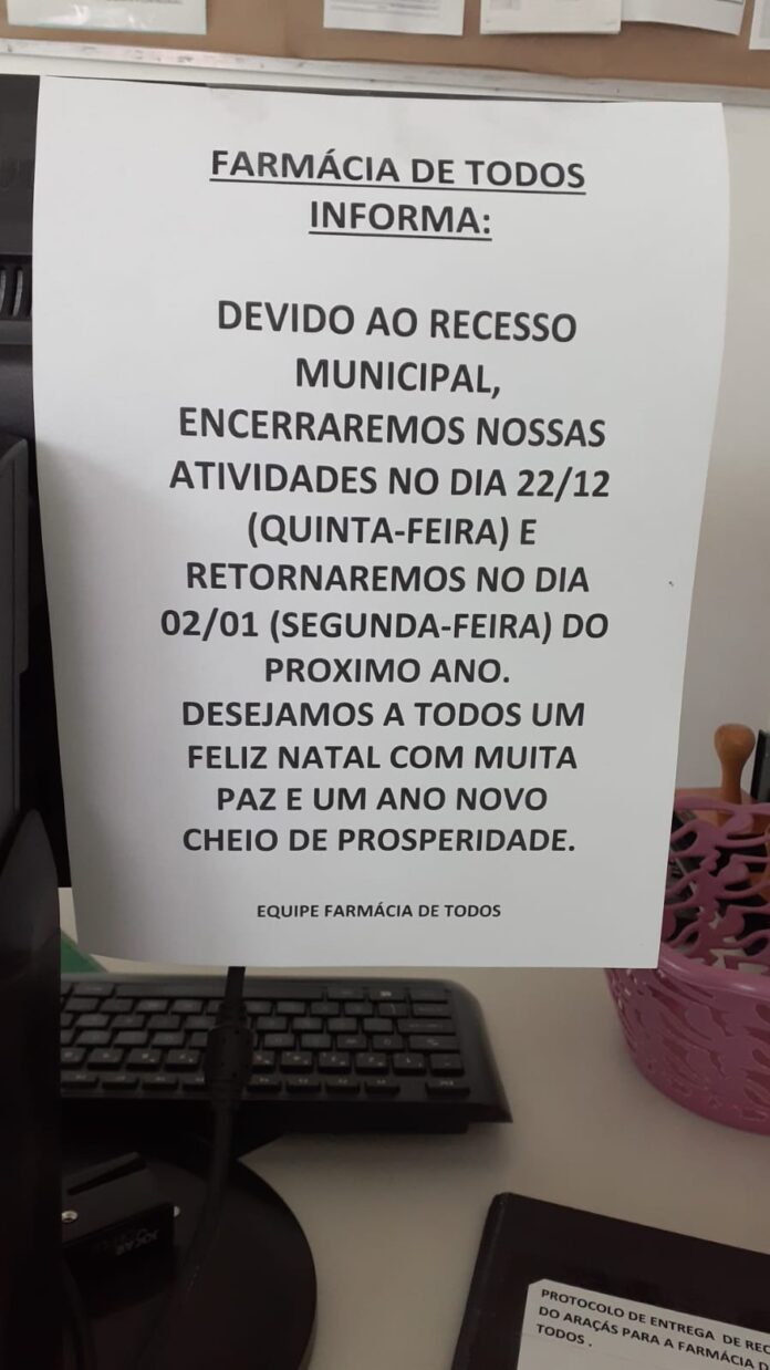 Quem depende do fornecimento contínuo de medicamentos controlados distribuídos gratuitamente pela Farmácia de Todos, de Mateus Leme, ficou surpreso ao se deparar com um recado da Farmácia de todos no início da semana. Um papel ofício na unidade dispensadora de medicamento informava que devido ao recesso municipal as atividades seriam suspensas na quinta-feira, 22, retornando apenas no dia 02 de janeiro. No informe, a equipe ainda desejava boas festas aos usuários.