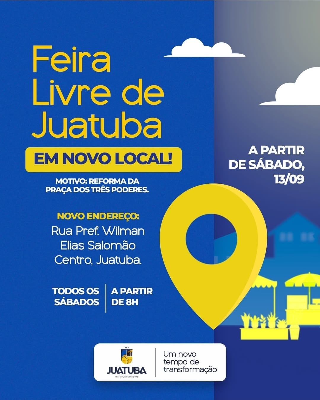 A Feira Livre Municipal de Juatuba foi transferida temporariamente para a Rua Prefeito Wilman Elias Salomão, em frente ao Centro Administrativo, devido às obras de revitalização da Praça Três Poderes, onde o evento era realizado.