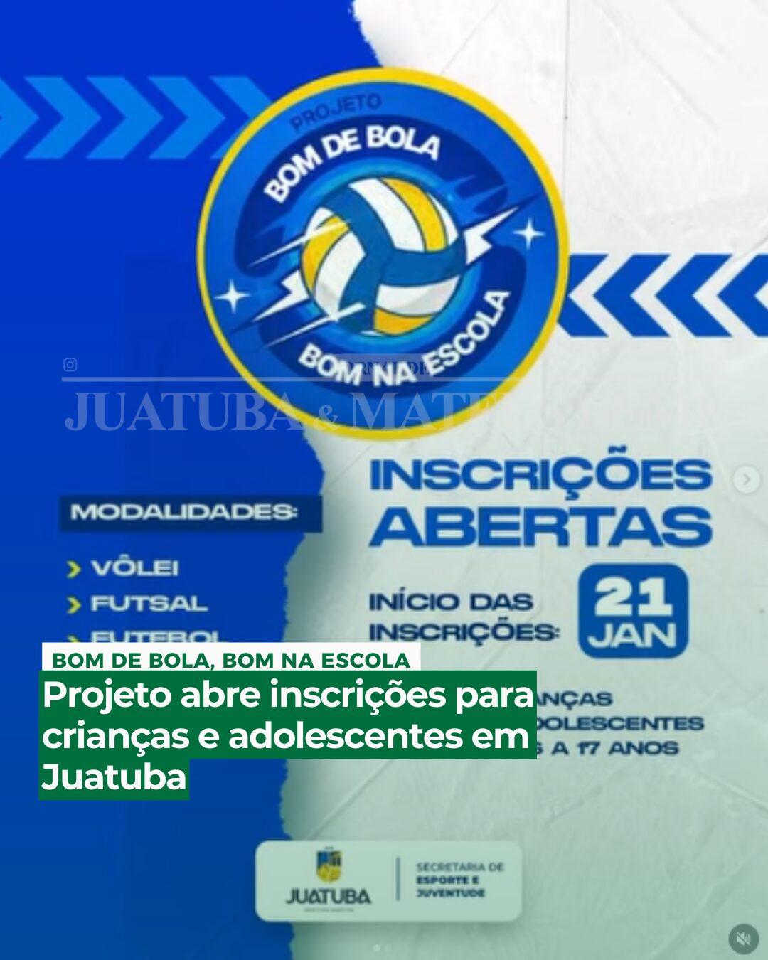 A Prefeitura de Juatuba abriu, na última terça-feira (21), as inscrições para o Projeto Bom de Bola, Bom na Escola. A iniciativa alia a prática esportiva ao incentivo à educação de crianças e adolescentes do município. Segundo a comunicação oficial, o projeto tem o objetivo promover a formação cidadã, estimular a disciplina, o trabalho em equipe e contribuir para a melhoria da qualidade de vida dos participantes por meio do esporte.