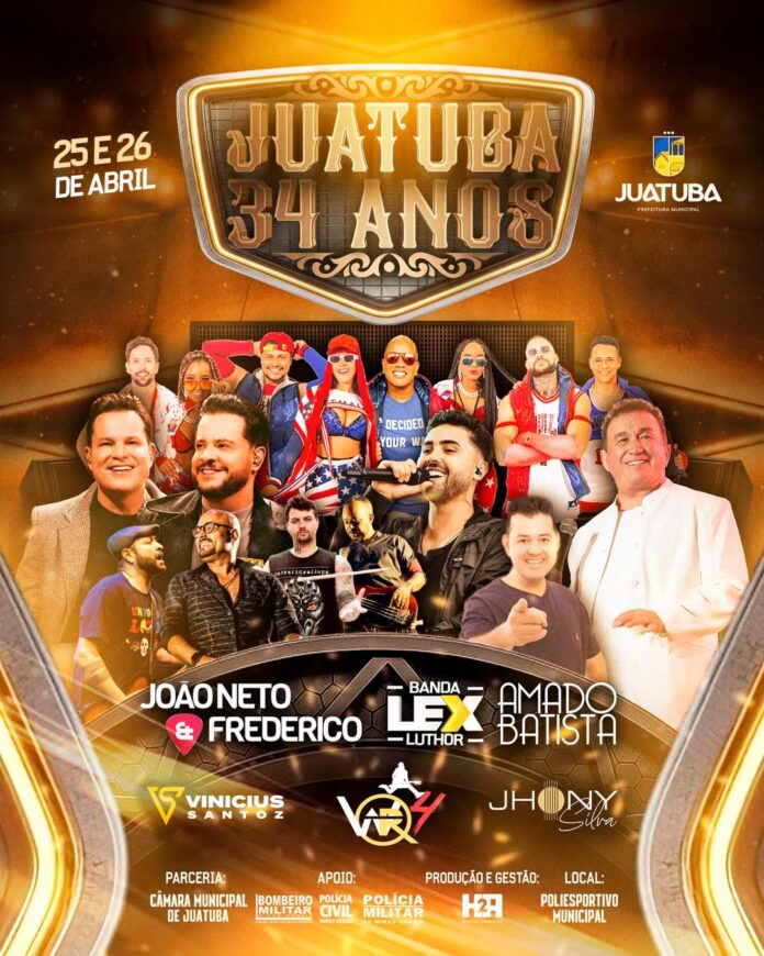 A cidade de Juatuba comemora seus 34 anos de emancipação com uma programação festiva nos dias 25 e 26 de abril, no Poliesportivo Municipal. O evento reúne atrações musicais, atividades culturais e opções de lazer voltadas para toda a população.