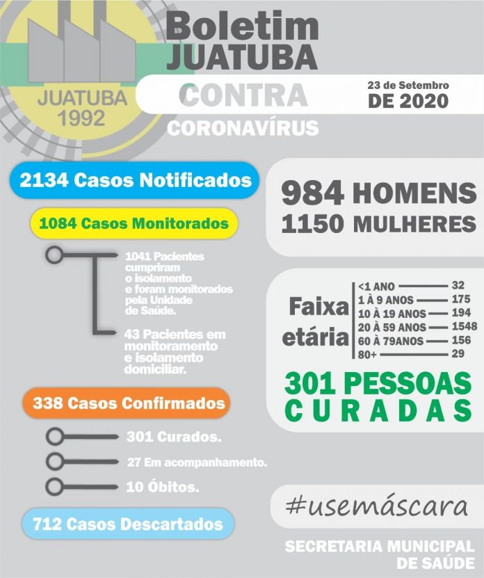 Dos notificados em Juatuba, 1.014 foram liberados após cumprir isolamento domiciliar e outros 43 seguem sendo monitorados em casa. Entre os casos confirmados, 301 são considerados recuperados e 10 pessoas perderam a vida na cidade em decorrência do contágio pela doença.