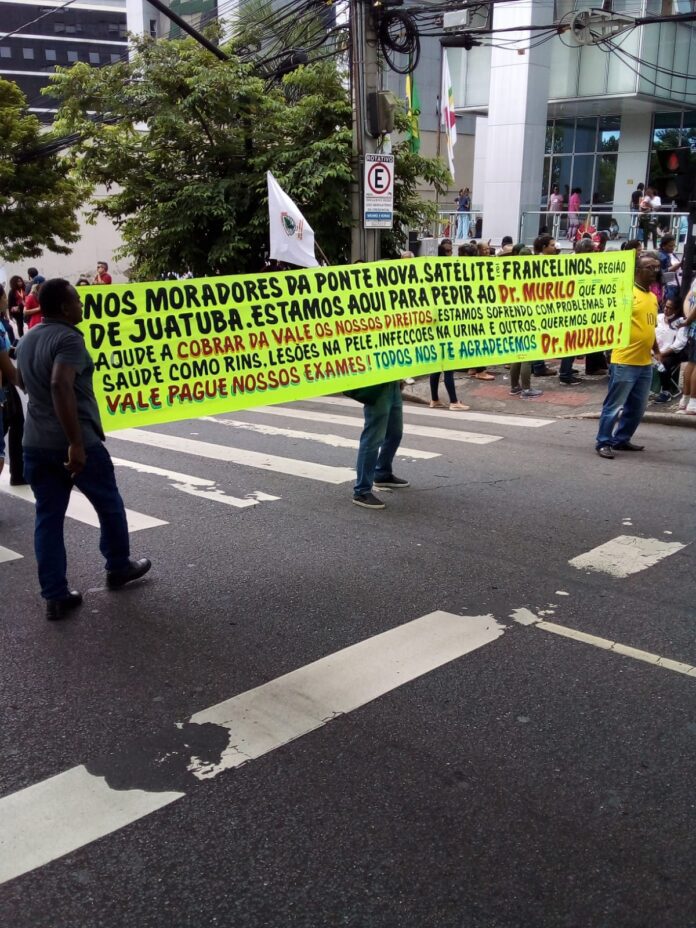 Com faixas e cartazes, os atingidos dos bairros Ponte Nova, Satélite e Francelinos, pediram socorro e responsabilização à mineradora Vale. “Estamos aqui para pedir ao Doutor Murilo que nos ajude a cobrar da Vale nossos direitos; estamos sofrendo com problemas de Saúde, nos rins, lesões na pele, infecção de urina e dentre outros. Queremos que a Vale pague nossos exames”, dizia uma das faixas.