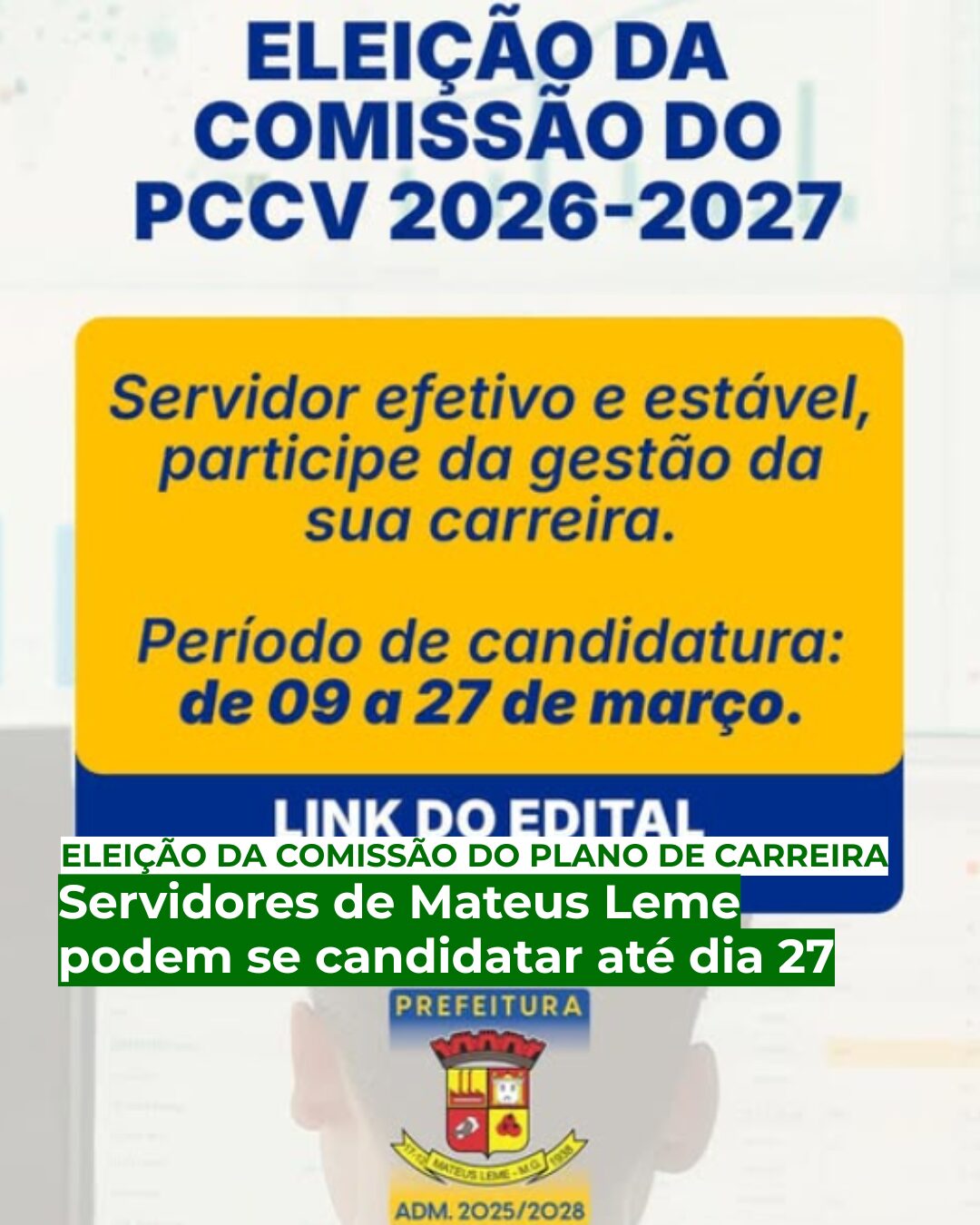 A Prefeitura de Mateus Leme publicou edital para a eleição dos representantes da Comissão de Gestão e Manutenção do Plano de Cargos, Carreiras e Vencimentos (CGMP) para o biênio 2026-2027. Segundo a prefeitura, o objetivo é garantir a participação direta dos servidores públicos na gestão e no aprimoramento do plano que organiza as carreiras e salários do funcionalismo municipal.
