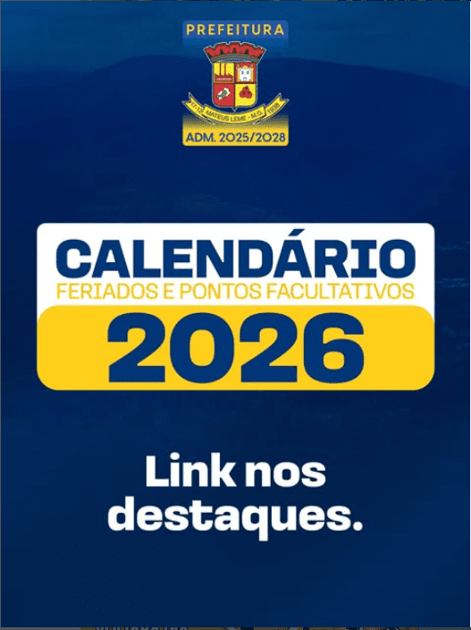 A prefeitura de Mateus Leme divulgou o calendário de feriados e pontos facultativos de 2026. Em fevereiro, os dias 16 (segunda-feira), 17 (terça-feira) e 18 (quarta-feira) serão considerados pontos facultativos, em comemoração ao Carnaval e Quarta-Feira de Cinzas. No mês de abril, haverá ponto facultativo no dia 2, quinta-feira; feriado da Paixão de Cristo no dia 3, sexta-feira; ponto facultativo no dia 20, segunda-feira; e feriado de Tiradentes no dia 21, terça-feira.