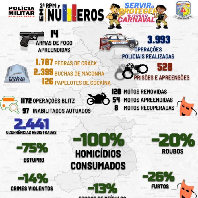 O Carnaval deste ano em Minas foi marcado por uma significativa redução nos índices de criminalidade e, mesmo com o aumento do público nas ruas, todos os crimes monitorados apresentaram queda, tanto na capital quanto no interior.