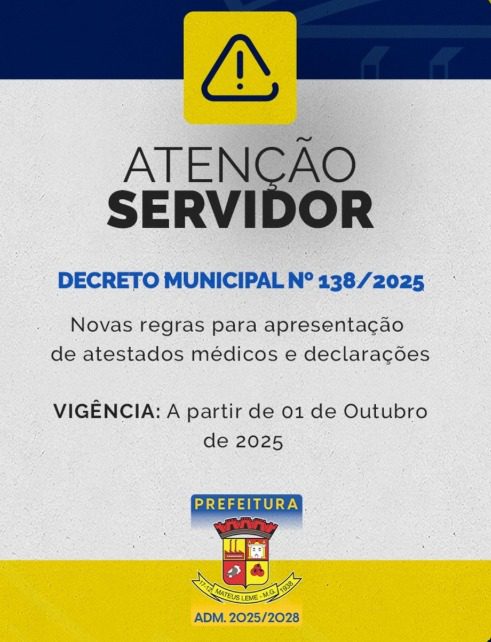 A Prefeitura de Mateus Leme publicou o Decreto Municipal nº 138/2025, que entrou em vigor na última segunda-feira (29) e estabelece novas regras para a apresentação de atestados médicos, declarações de comparecimento e relatórios de acompanhamento de familiares. A norma, segundo a prefeitura, tem como objetivo padronizar os procedimentos administrativos, trazendo mais clareza tanto para os servidores quanto para a gestão.