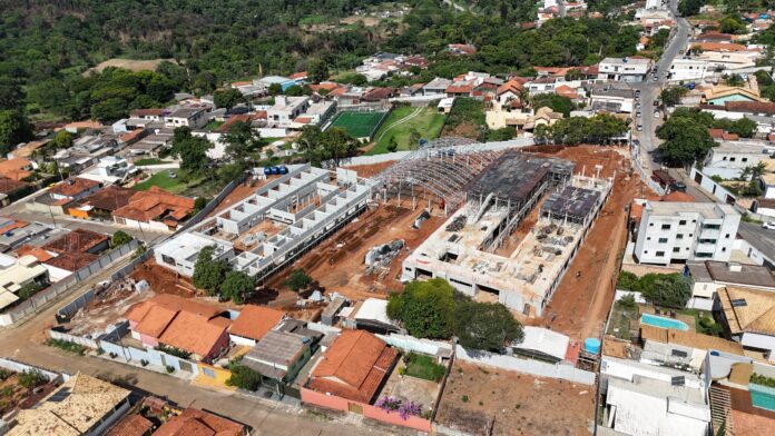 A Escola e Creche do Centro também apresenta avanços importantes. A escola está finalizando a laje do segundo pavimento, enquanto a alvenaria do primeiro já foi concluída e o muro perimetral está em fase de fechamento. Na creche, as alvenarias foram finalizadas e a cobertura está prestes a ser instalada. A quadra avança com a montagem da estrutura metálica, que deve ser concluída nos próximos dias.