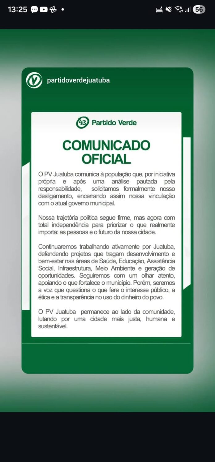 O diretório municipal do Partido Verde (PV) em Juatuba anunciou oficialmente o encerramento de sua vinculação com a base do atual governo. Em comunicado divulgado recentemente, a legenda informou que a decisão foi tomada após análise interna e é pautada em critérios de responsabilidade política.