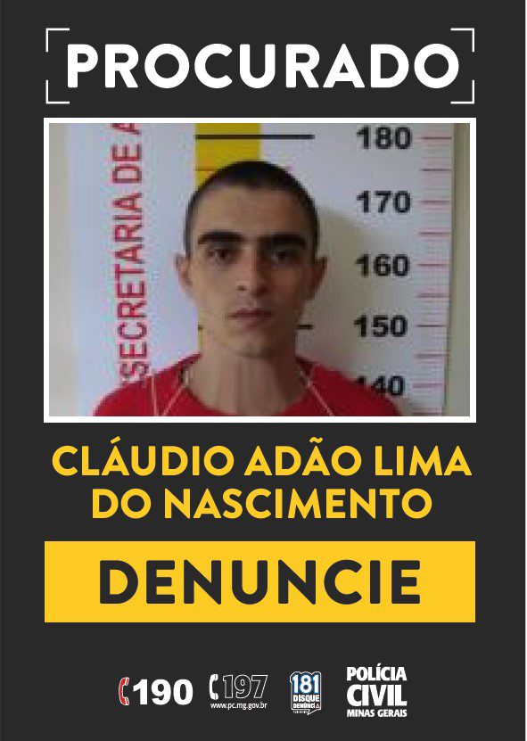 A Polícia Civil de Minas Gerais (PCMG) procura por Cláudio Adão Lima do Nascimento, foragido da Justiça e condenado a mais de 40 anos de prisão. Ele foi sentenciado por dois homicídios qualificados cometidos no município de Paraopeba, região Central do estado. O investigado esteve preso provisoriamente por dois anos, até que fugiu do sistema prisional em 16 de abril de 2014. Desde então, diversos mandados de recaptura foram expedidos, e ele segue sendo procurado.