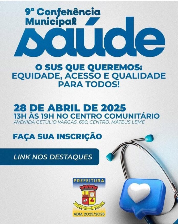 A Prefeitura de Mateus Leme, por meio da Secretaria Municipal de Saúde, realiza no próximo dia 28, a 9ª Conferência Municipal de Saúde, com o tema “O SUS que Queremos: Equidade, Acesso e Qualidade para Todos!”.