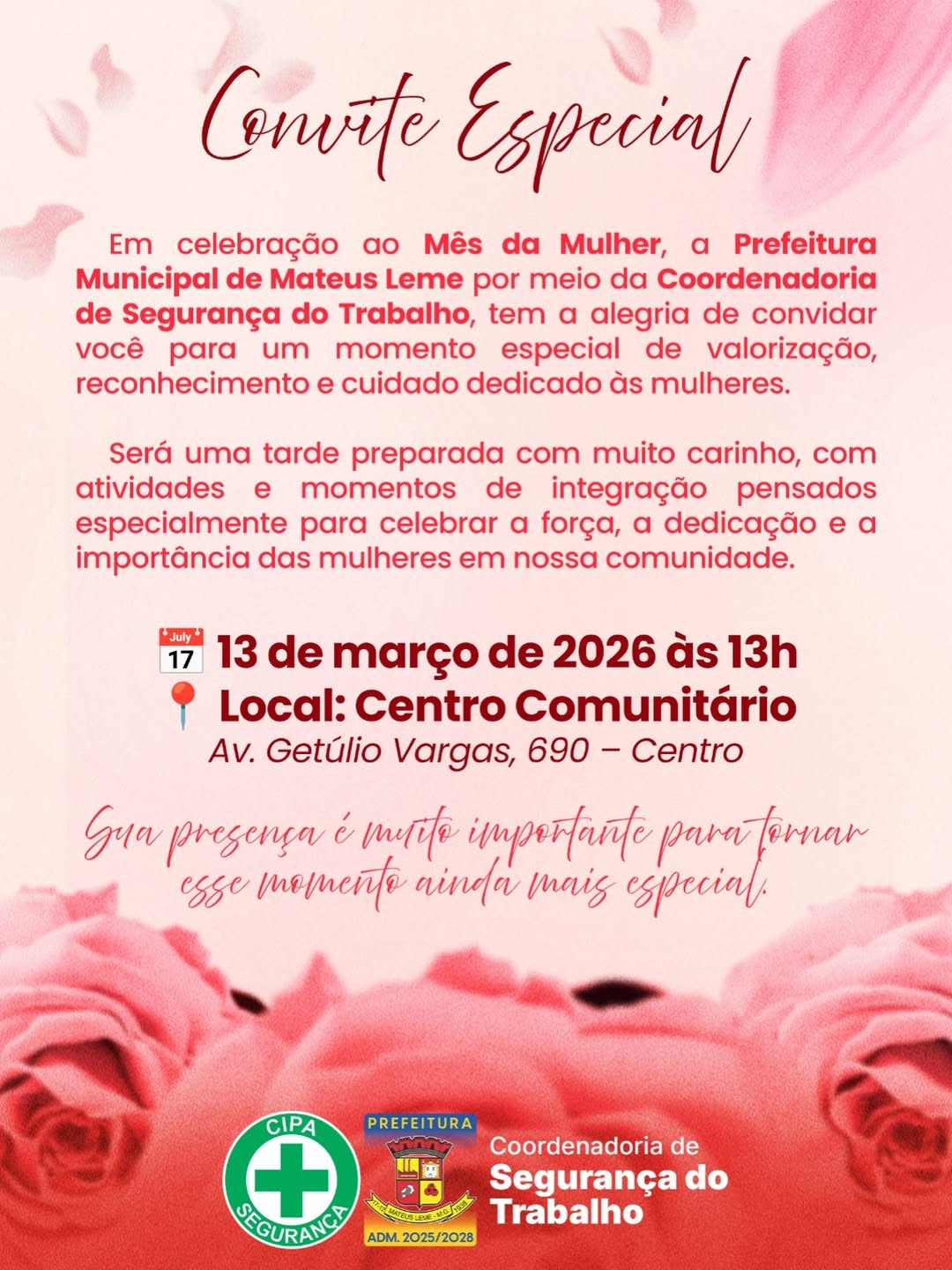A Prefeitura de Mateus Leme, por meio da Coordenadoria de Segurança do Trabalho, realizará na próxima sexta-feira, 13 de março, um evento especial em celebração ao Mês da Mulher. A iniciativa tem como objetivo promover um momento de valorização, reconhecimento e cuidado dedicado às mulheres da comunidade.