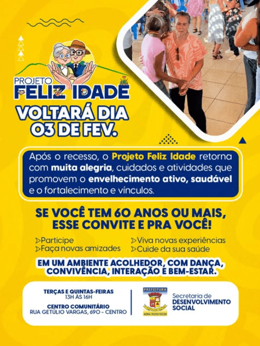 O Projeto Feliz Idade, referência em políticas públicas voltadas à população idosa de Mateus Leme, retoma oficialmente suas atividades na próxima terça-feira (3). Reconhecido como um espaço de convivência, cuidado e socialização, o projeto oferece uma programação diversificada que estimula o bem-estar físico, emocional e social dos participantes. As atividades acontecem sempre às terças e quintas-feiras, das 13h às 16h, no Centro Comunitário, localizado na Rua Getúlio Vargas, nº 690, no Centro da cidade, que voltou a ser a sede oficial do projeto na atual gestão.
