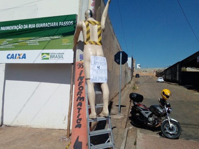 Um morador resolveu chamar atenção da administração, ao colocar um manequim de loja amarrado em uma escada, simulando a subida no poste. A manifestação inusitada foi feita na esquina das ruas Guaraciaba Passos e Lataliza no Centro.