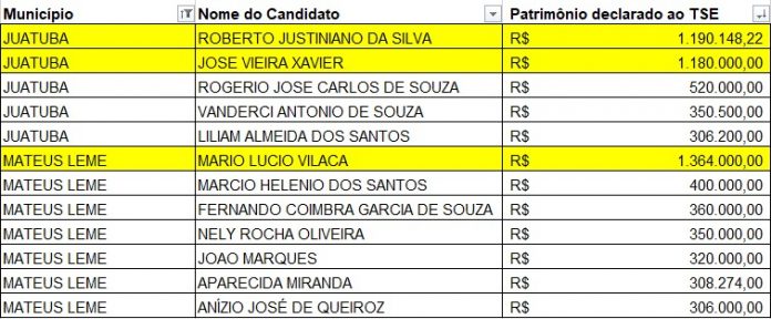 Enquanto isso, em Mateus Leme, o candidato a vereador Mário Lúcio Vilaça (PTC) listou R$1.364.000 em bens, compostos por três veículos, uma casa e um prédio comercial com oito lojas e três apartamentos em Azurita. Ele estava recebendo o auxílio emergencial de R$ 600 solicitado pelo aplicativo da Caixa e suspenso após decisão do TCU. Na cidade, ele é o único candidato com patrimônio superior a R$ 1 milhão.
